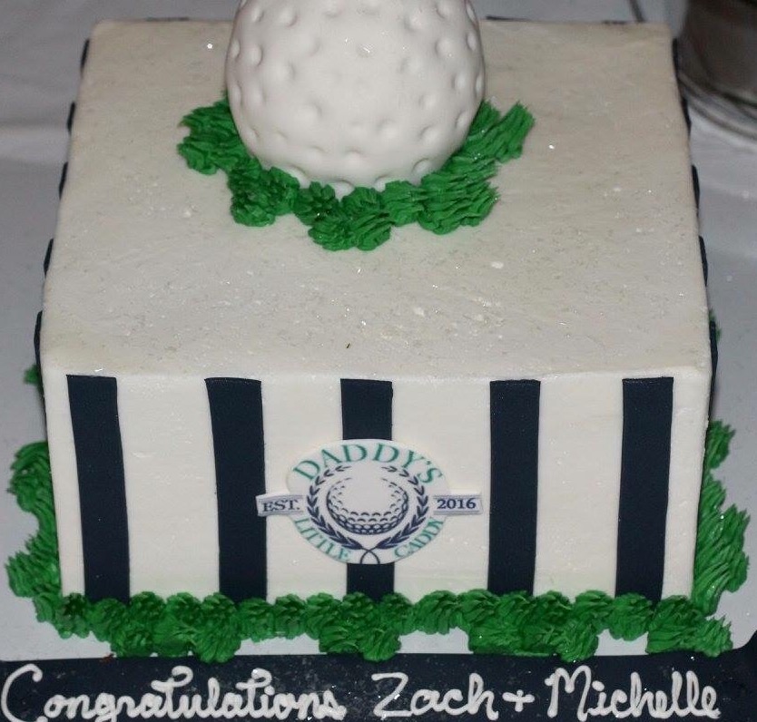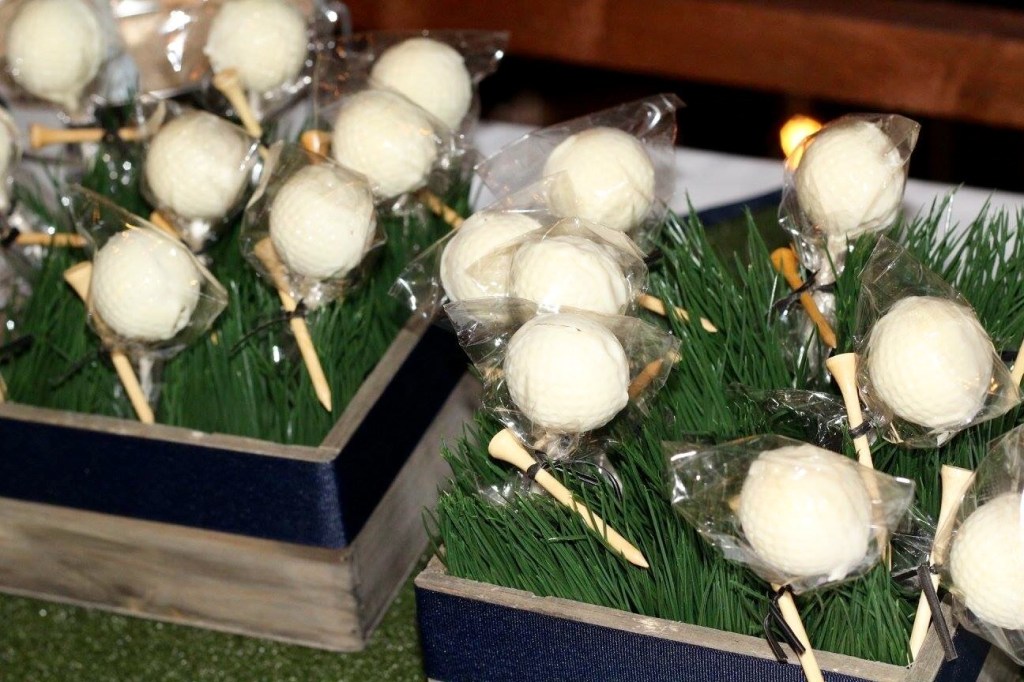 We used bright yellow flowers in the centerpieces. In keeping with the preppy golf theme, we grounded these on squares of artificial grass that were bound with navy grosgrain. It was a no-brainer to use golf balls as vase fillers!